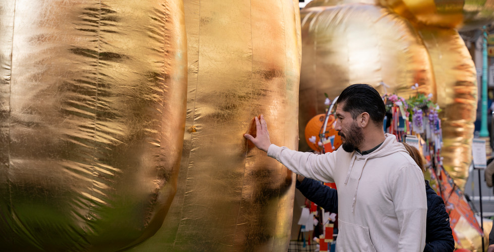 "Arm Day, Leg Day" offers a playful take on traditional Chinese guardian lions and beckoning cats, blending symbols of protection and good fortune. Festival-goers who pet these inflatable cats can receive “福 Body Protection,” a clever nod to the Chinese character for good fortune (福) and the idea of full-body wellness and strength. Guardian lions are revered as protectors, while beckoning cats are believed to attract prosperity, "Arm Day, Leg Day" brings a fresh interpretation of these traditional symbols through large scale inflatable installations. The emphasis on physical strength and vitality also aligns with the cultural importance placed on health and wellbeing during this celebratory time of year.